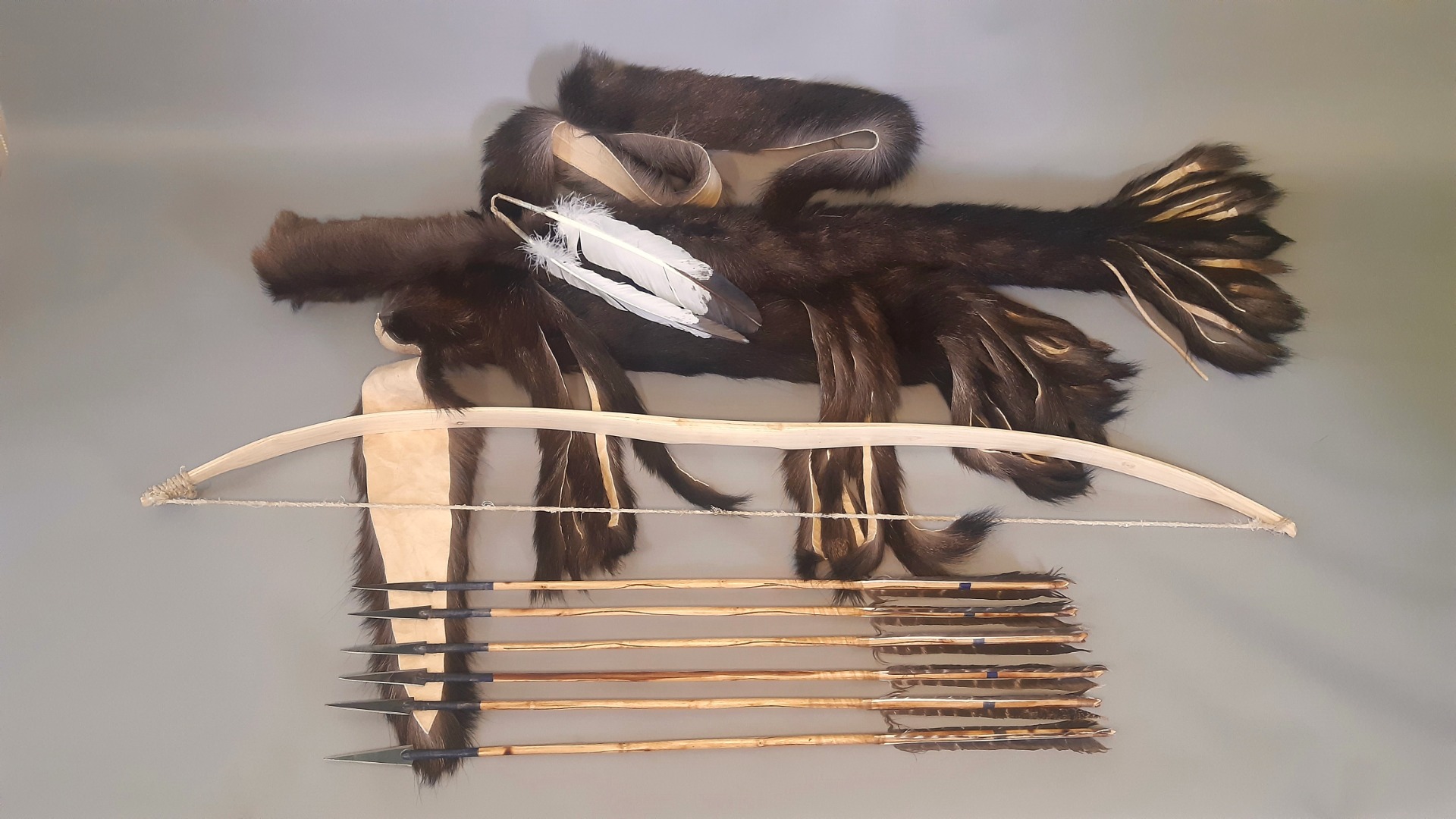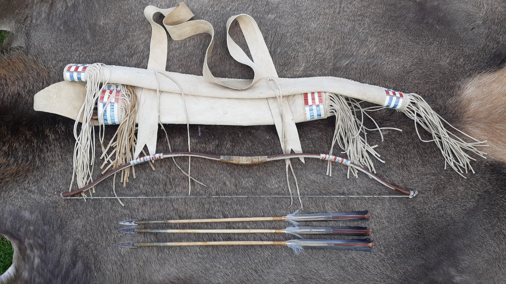 Súprava v štýle Severných pláni. Tulec je ušitý z mozgom činenej a vyúdenej kožušiny daniela, ozdobený dvomi pierkami. Luk je vyrobený z jaseňa, má vytvarovaný reflex v madle a deflex na ramenách. Dĺžka luku 110cm (43inch) 40lb/20inch. Tetiva je upletená z byvolej šľachy. Šípy sú drieňové, bikonické s dvomi drážkami v tvare blesku. Pierka sú z...
